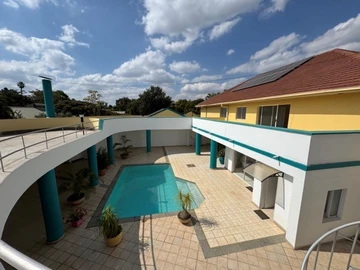 Exceptional Mount Pleasant family estate on 4,051 m² with approximately 1,000 m² of living space — a striking yellow-and-turquoise residence offering 9 bedrooms and 8 bathrooms. Arrive down a wide brick drive to covered parking and a dramatic façade with mature palms and solar panels on the tiled roof. The centrepiece is a private tiled courtyard with an intimate swimming pool surrounded by a colonnaded veranda and a spiral staircase leading to a rooftop terrace and circular viewing pavilion.