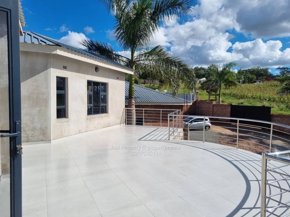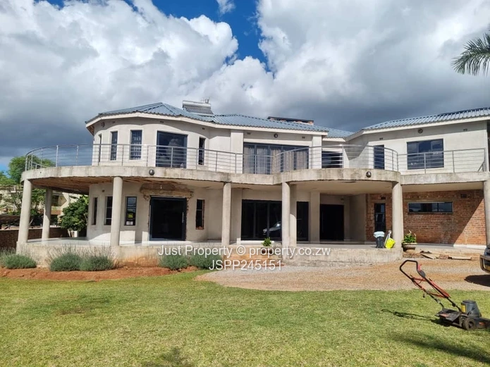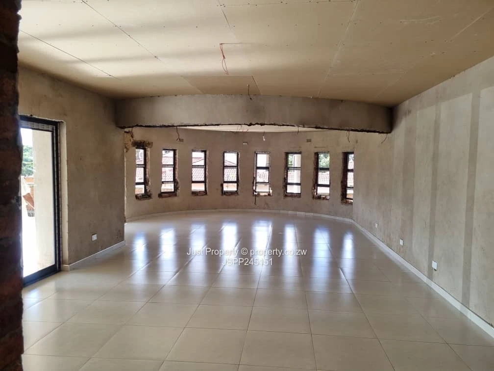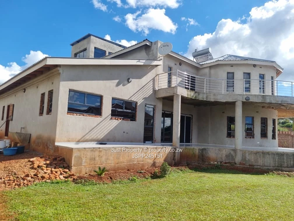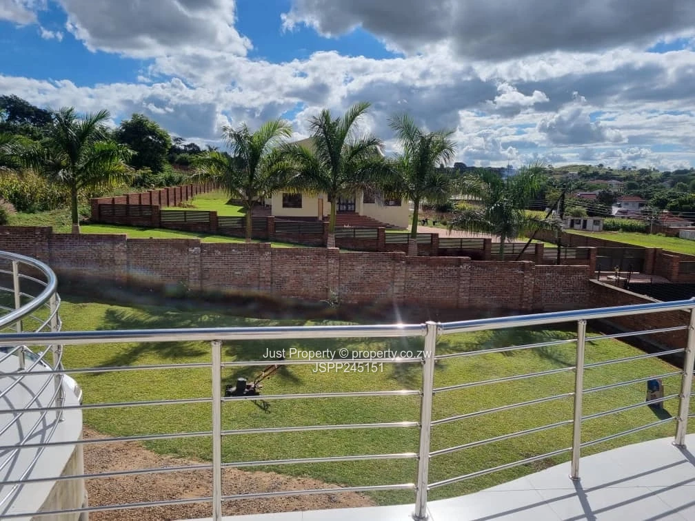 Incomplete family home in Brookview, Harare North — a rare 2000 m² stand with a substantial 500 m² two-storey residence. As seen in the photos, the house commands an elevated position with sweeping curved terraces and stainless-steel balcony railings that capture wide suburban views. The property offers five generous bedrooms all with en-suite bathrooms, expansive open-plan living areas and large windows that flood the interior with natural light.